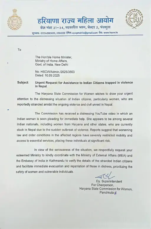 आयोग ने केंद्रीय गृह मंत्री को भेजे पत्र में लिखा- एक वीडियो मिला है, जिसमें एक भारतीय महिला मदद की गुहार लगाते हुए नजर आ रही है। जो बता रही है कि वहां पर भारतीय और हरियाणवी महिलाएं काफी संख्या में फंसी हुई हैं। सभी लोग सुरक्षित निकल नहीं पा रहे हैं। रिपोर्ट्स के अनुसार, नेपाल के हिंसा प्रभावित इलाकों में कानून-व्यवस्था पूरी तरह बिगड़ चुकी है। वहां आवाजाही पर कड़े प्रतिबंध लगाए गए हैं और जरूरी सेवाओं तक पहुंचना मुश्किल हो गया है। इन हालात के कारण फंसे हुए लोगों की जान को गंभीर खतरा है।