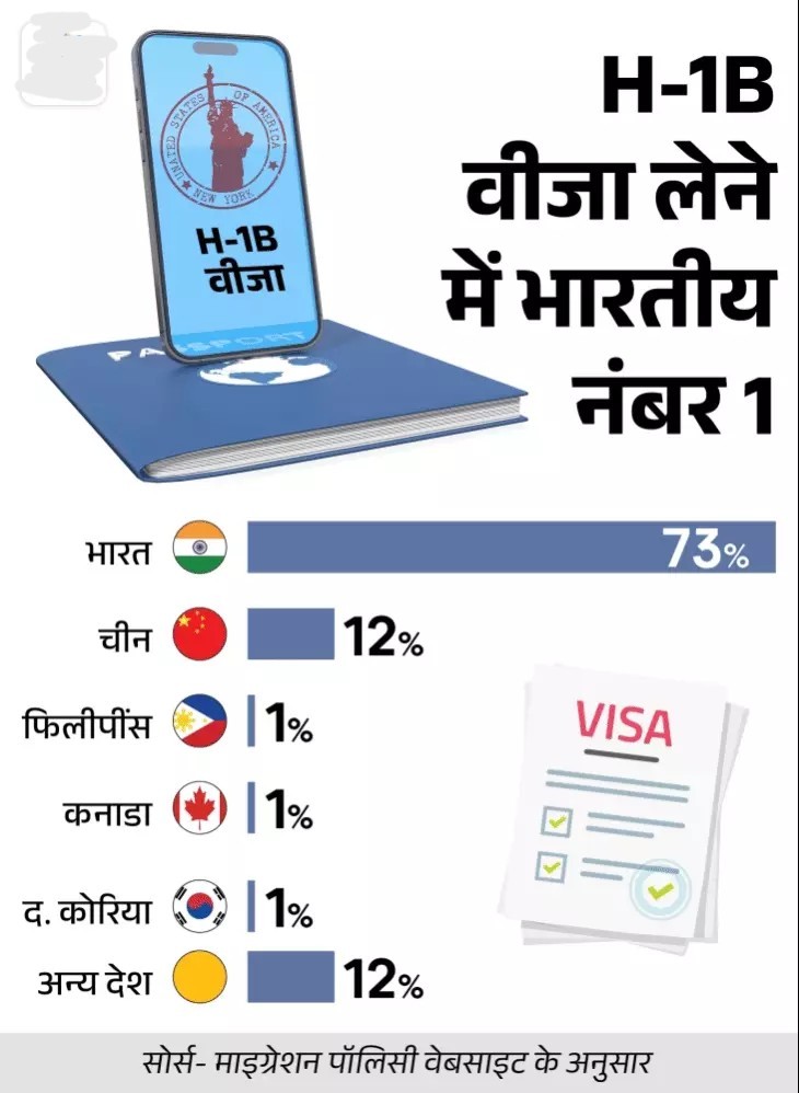 H-1B वीजा के लिए पहले औसतन 5 लाख रुपए लगते थे। यह 3 साल के लिए मान्य होता था। इसे 3 साल के लिए रिन्यू किया जा सकता था। अब अमेरिका में H-1B वीजा के लिए 6 साल में 5.28 करोड़ लगेंगे, यानी खर्च करीब 50 गुना से ज्यादा बढ़ जाएगा। अमेरिकी सरकार हर साल लॉटरी से 85,000 H-1B वीजा जारी करती है, जिनका इस्तेमाल ज्यादातर टेक नौकरियों में होता है। सबसे ज्यादा भारतीय (72%) इसका इस्तेमाल करते हैं। अब वीजा फीस बढ़ने से 3 लाख से ज्यादा भारतीयों पर इसका सीधा असर पड़ेगा।